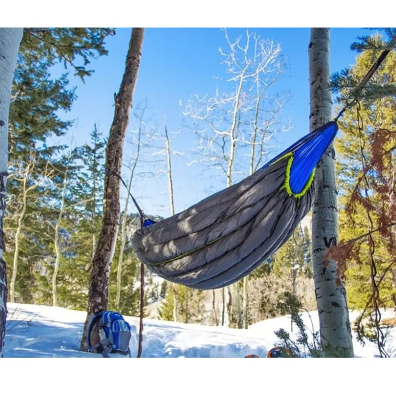 Vinterhengekøyen er en hengekøye spesielt designet for vintereventyr og campingaktiviteter. Sammenlignet med tradisjonelle campingtelt og soveposer, gir det et mer behagelig og behagelig sovemiljø samtidig som det sikrer varme og beskyttelse. Fordelene med dette produktet er åpenbare. For det første er utformingen av Winter Hammock veldig ergonomisk. Både kroppskurven og tyngdepunktets balanse har blitt tatt i betraktning optimalt, noe som fullt ut sikrer brukerens komfort og sikkerhet. For det andre bruker Winter Hammock patentert vinter termisk isolasjonsteknologi for å løse det uunngåelige varmeisolasjonsproblemet under camping og kan holde varmen selv i ekstremt kaldt vær. I tillegg er den beskyttende ytelsen til Winter Hammock også veldig god, noe som effektivt kan forhindre angrep av mygg, edderkopper og andre små insekter. Det er også en mer miljøvennlig og bærekraftig måte å campe på, siden det ikke krever å sette opp telt eller ta mye plass, og det ikke etterlater merker på bakken. Vinterhengekøye er et meget utmerket og praktisk vintercampingutstyr som lar brukere nyte et mer behagelig og tryggere sovemiljø under utendørsaktiviteter, og er også mer miljøvennlig og bærekraftig.